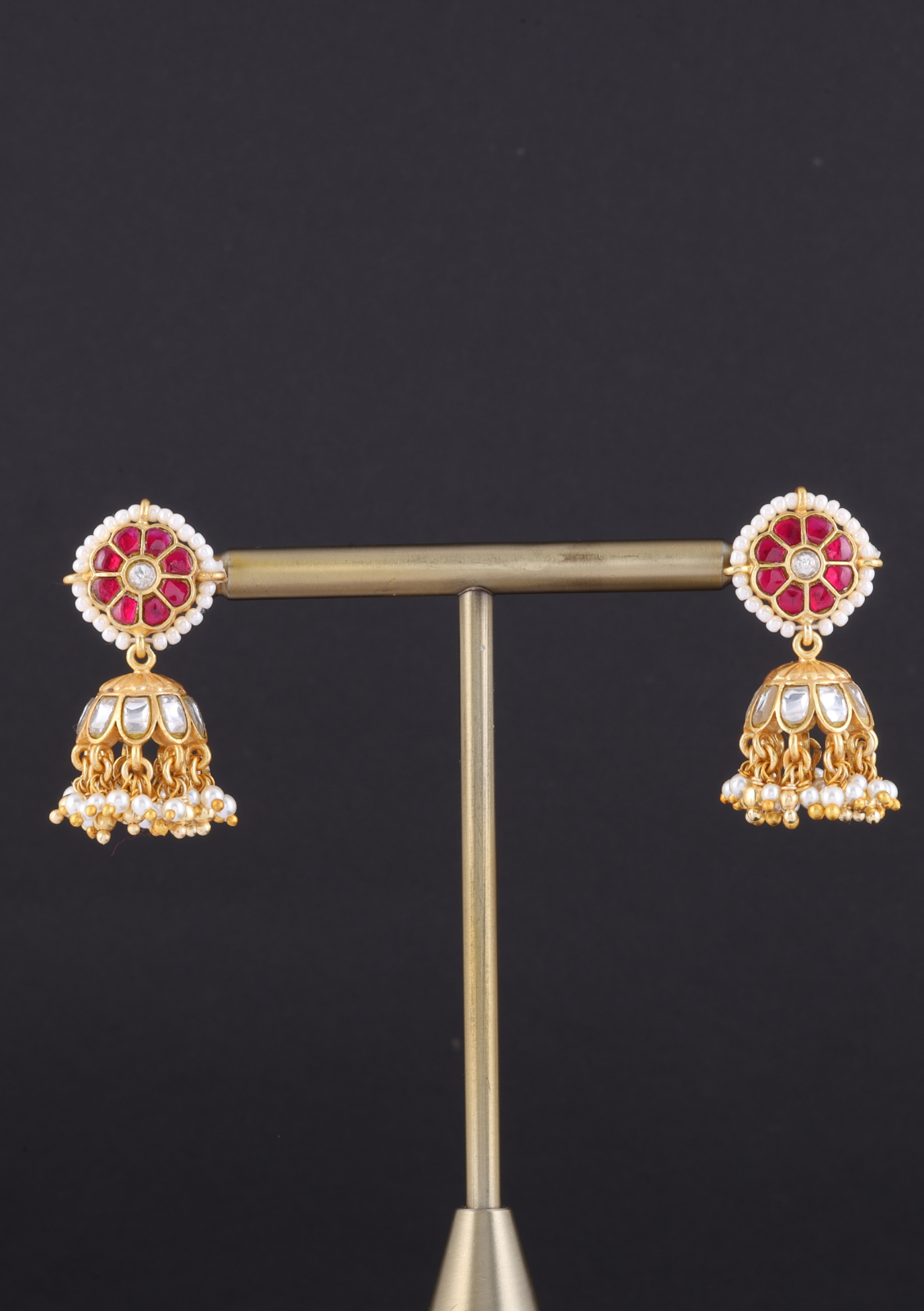 Add a touch of elegance with these stunning Motiya Jadau Kundan Jhumkas, crafted with 22K gold plating for a luxurious, long-lasting shine.